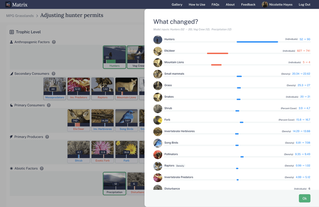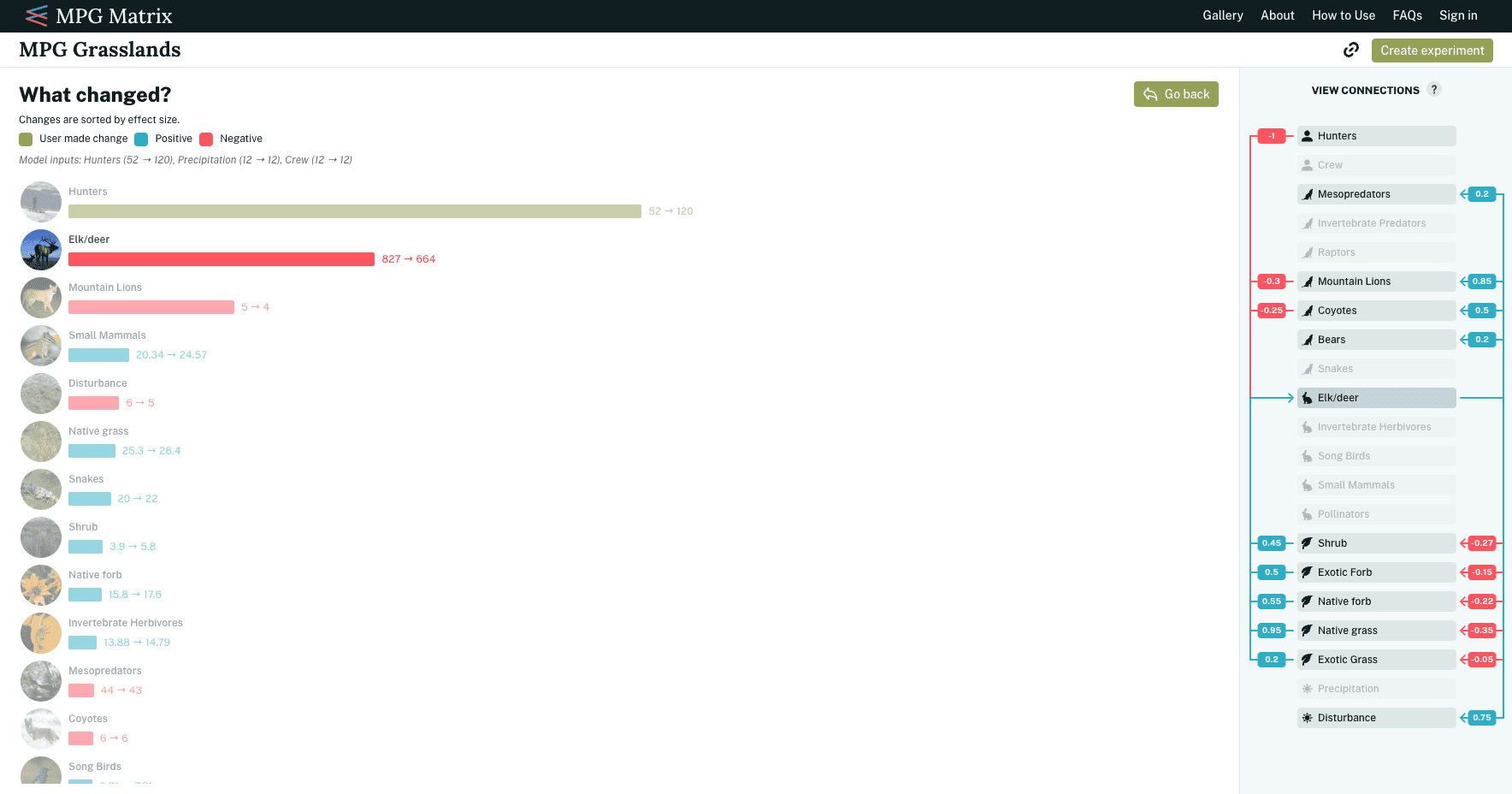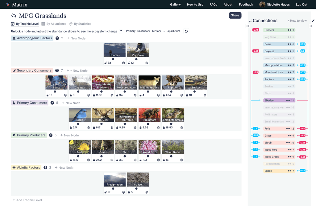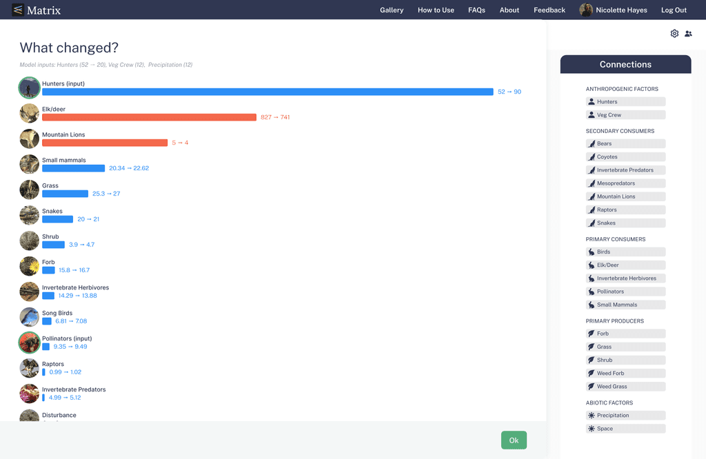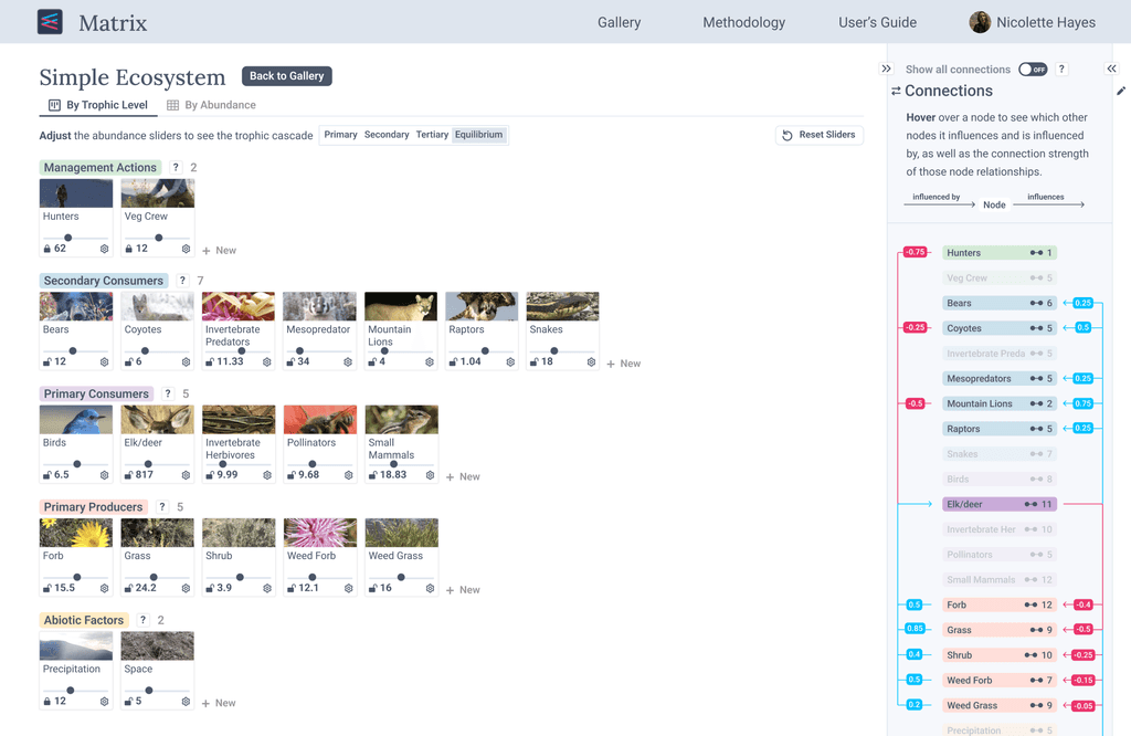 For less technical users, we added an experimentation layer that allows small adjustments to existing matrices without editing the underlying data. Users can manipulate abundance sliders on nodes to explore changes that aren’t saved. In the example below, a user hovers over “Elk/Deer” and sees its connections to other nodes displayed on the panel to the right.