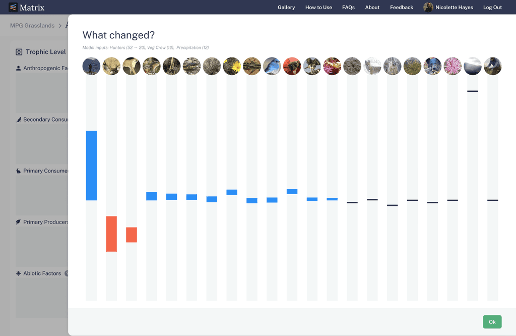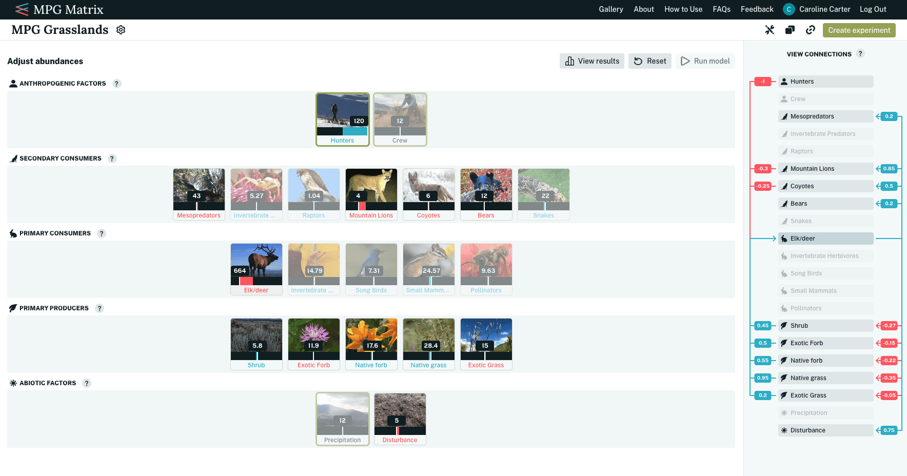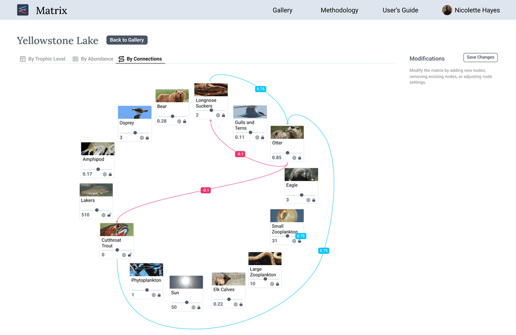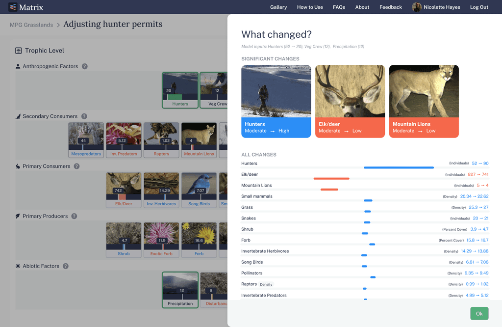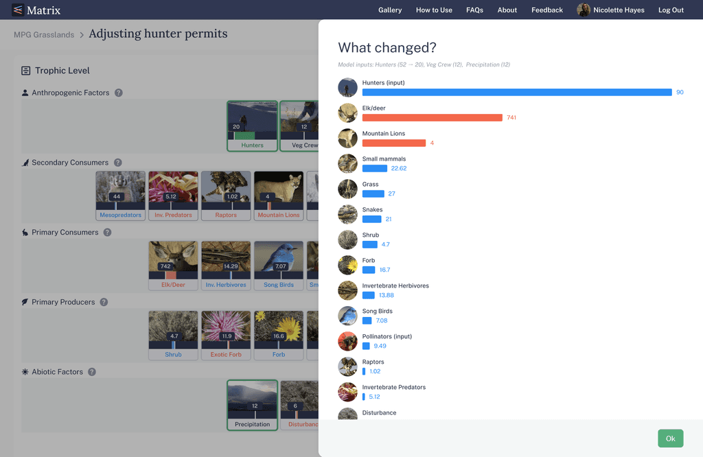For less technical users, we added an experimentation layer that allows small adjustments to existing matrices without editing the underlying data. Users can manipulate abundance sliders on nodes to explore changes that aren’t saved. In the example below, a user hovers over “Elk/Deer” and sees its connections to other nodes displayed on the panel to the right.