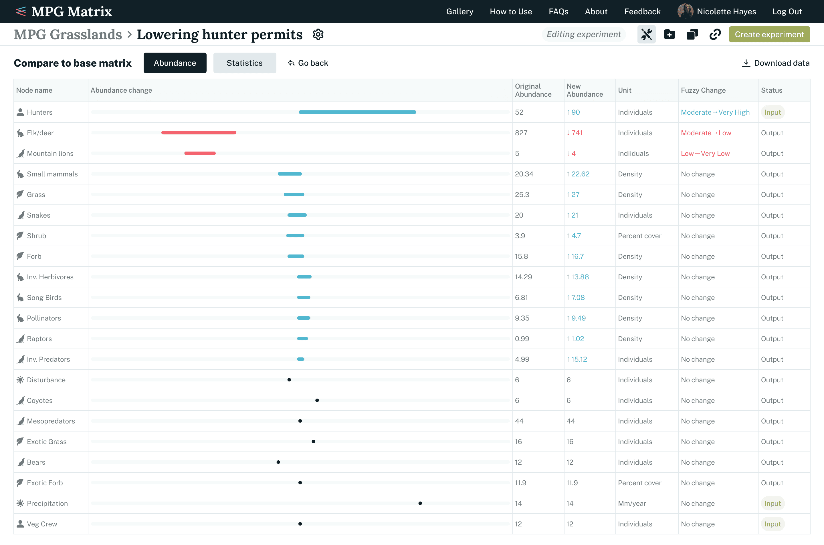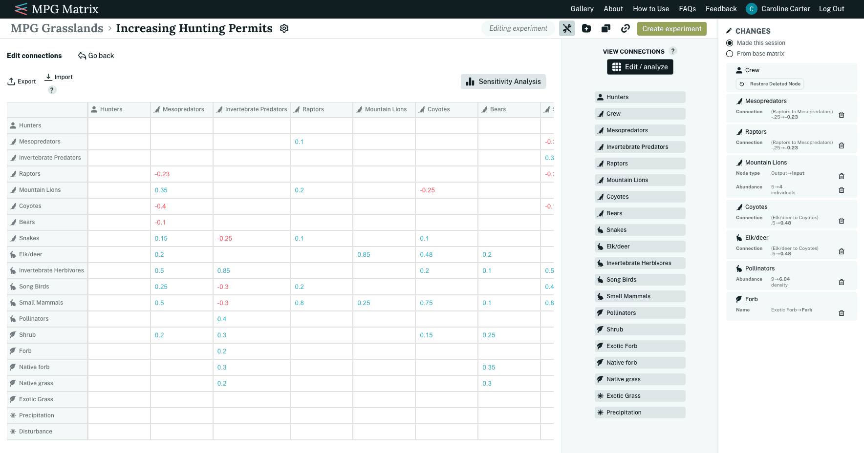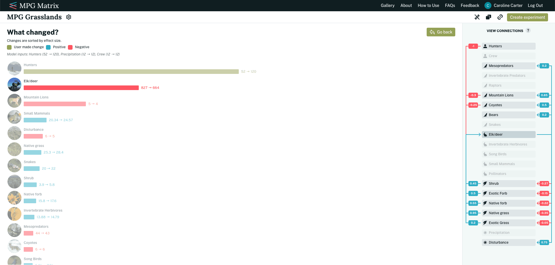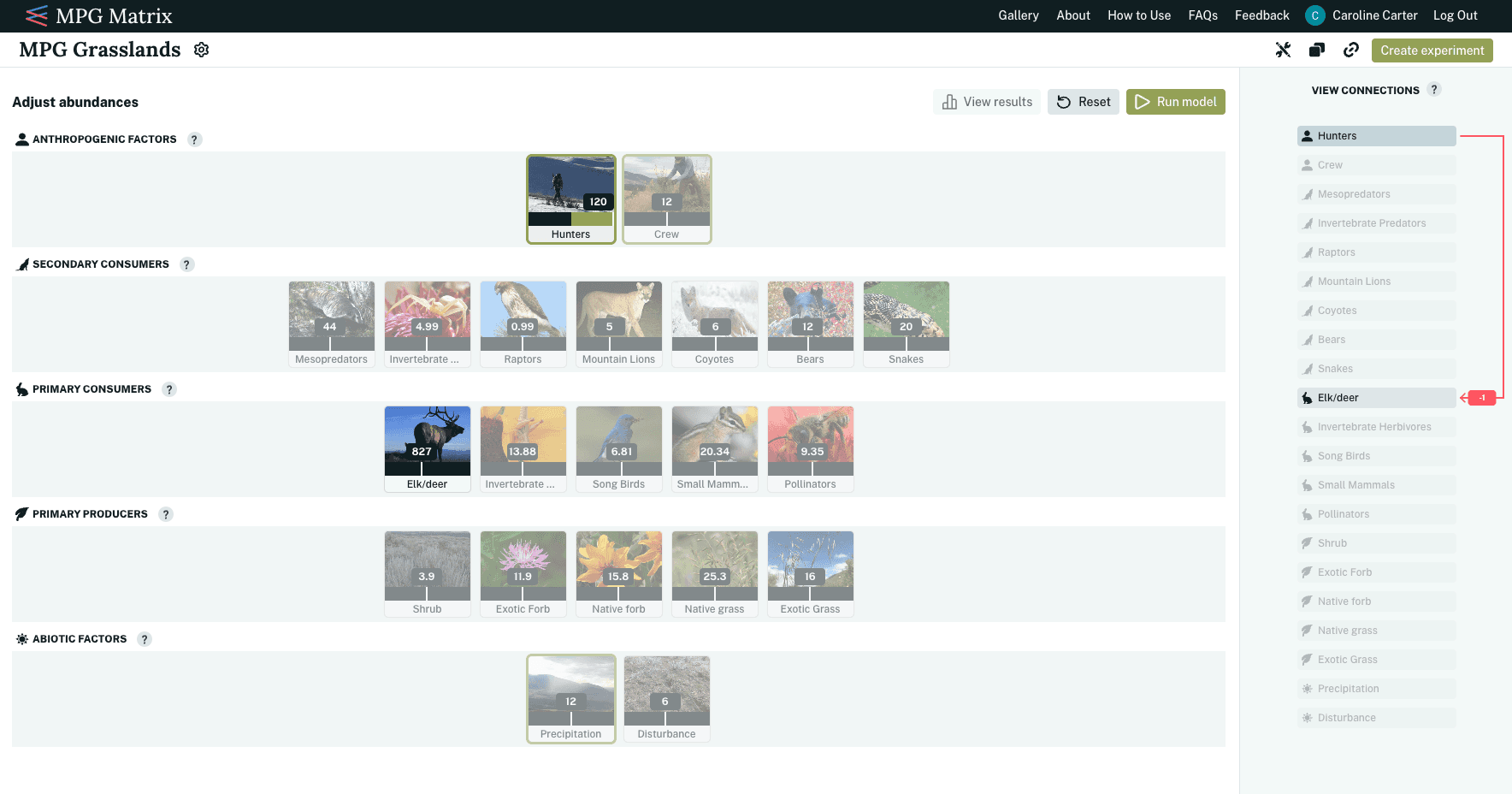 For less technical users, we added an experimentation layer that allows small adjustments to existing matrices without editing the underlying data. Users can manipulate abundance sliders on nodes to explore changes that aren’t saved. In the example below, a user hovers over “Elk/Deer” and sees its connections to other nodes displayed on the panel to the right.