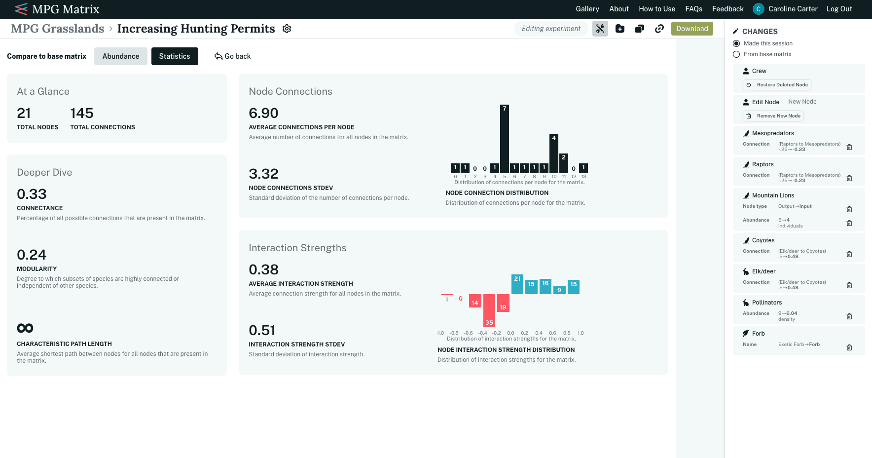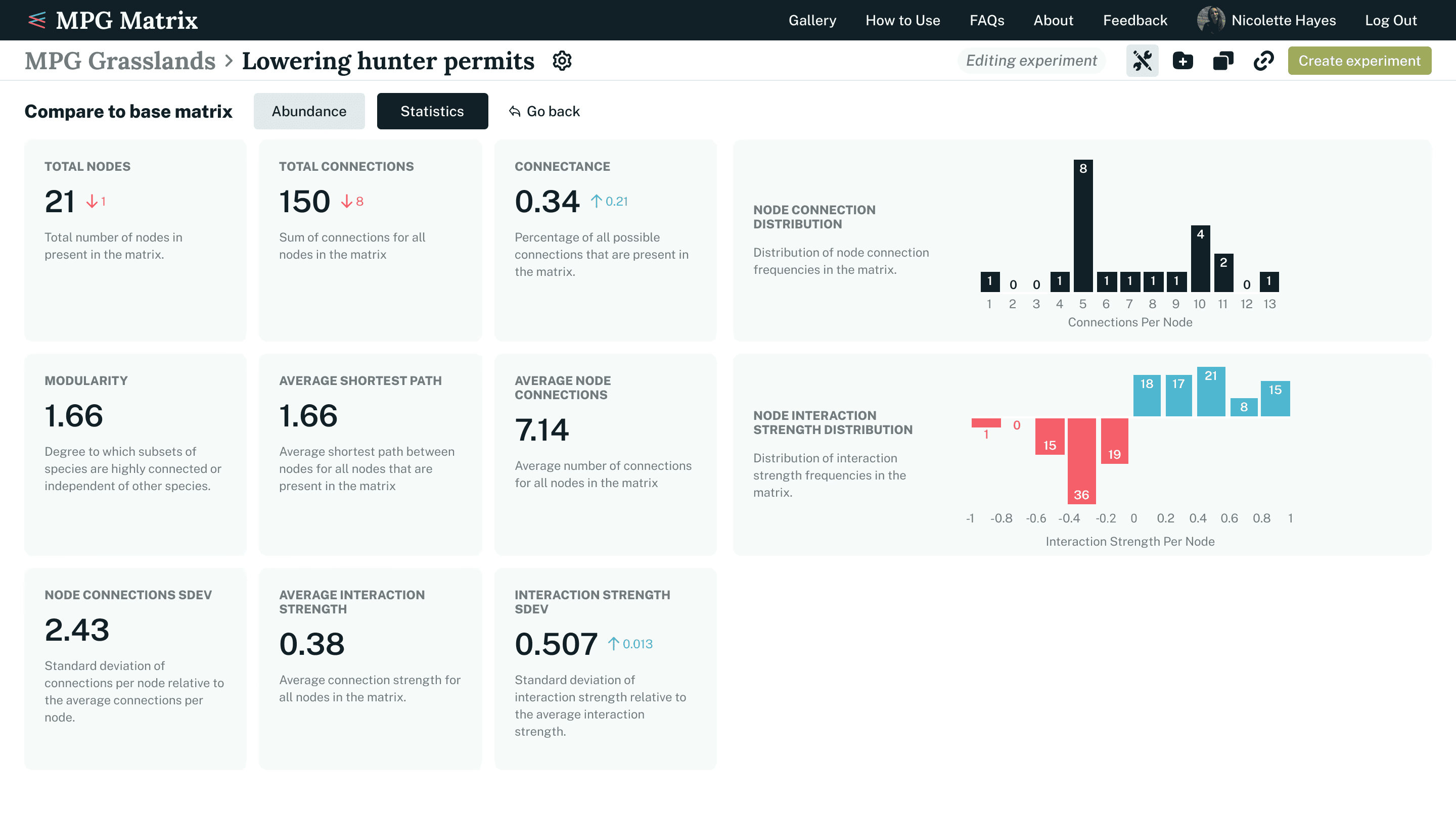 Any updates to a node in a matrix affect the overall ecosystem. To support decision-making, we created additional views that display general statistics and node abundances in multiple ways, giving users clearer insight into the impact of their changes.