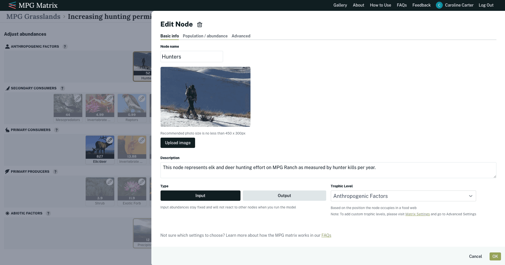 When setting up a matrix, users can add new nodes or modify existing ones. They start by entering basic information about the node, including its name, description, and trophic level. Users can also specify whether a node is an "Input" or "Output," which determines how it behaves within the model.