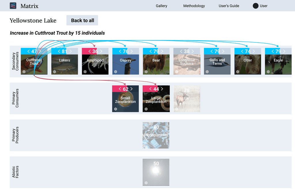 The final matrix view featured a center-aligned diagram of interactive nodes, accompanied by a secondary panel showing the node connections. Users can hover over a node in either the main view or the connections panel to reveal arrows indicating which other nodes it affects or is affected by, along with the degree of impact. We also added a "Create Experiment" button, guiding users to test hypotheses and explore ecosystem dynamics.
