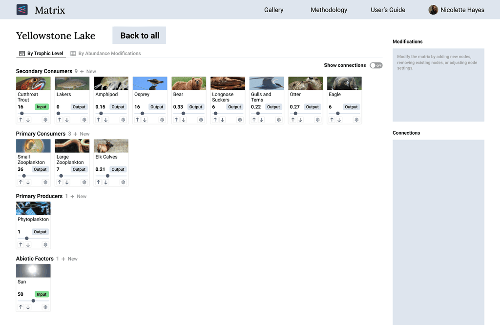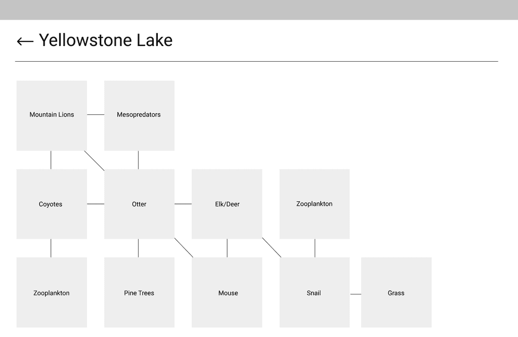 We began our wireframing process by iterating on the main matrix view, where users could explore an ecosystem. This view needed to display each node’s details, including its name, picture, relative abundance, and trophic level, as well as the relationships between nodes. We explored different ways to show these connections without visually overwhelming the user, focusing on making information accessible while maintaining clarity.