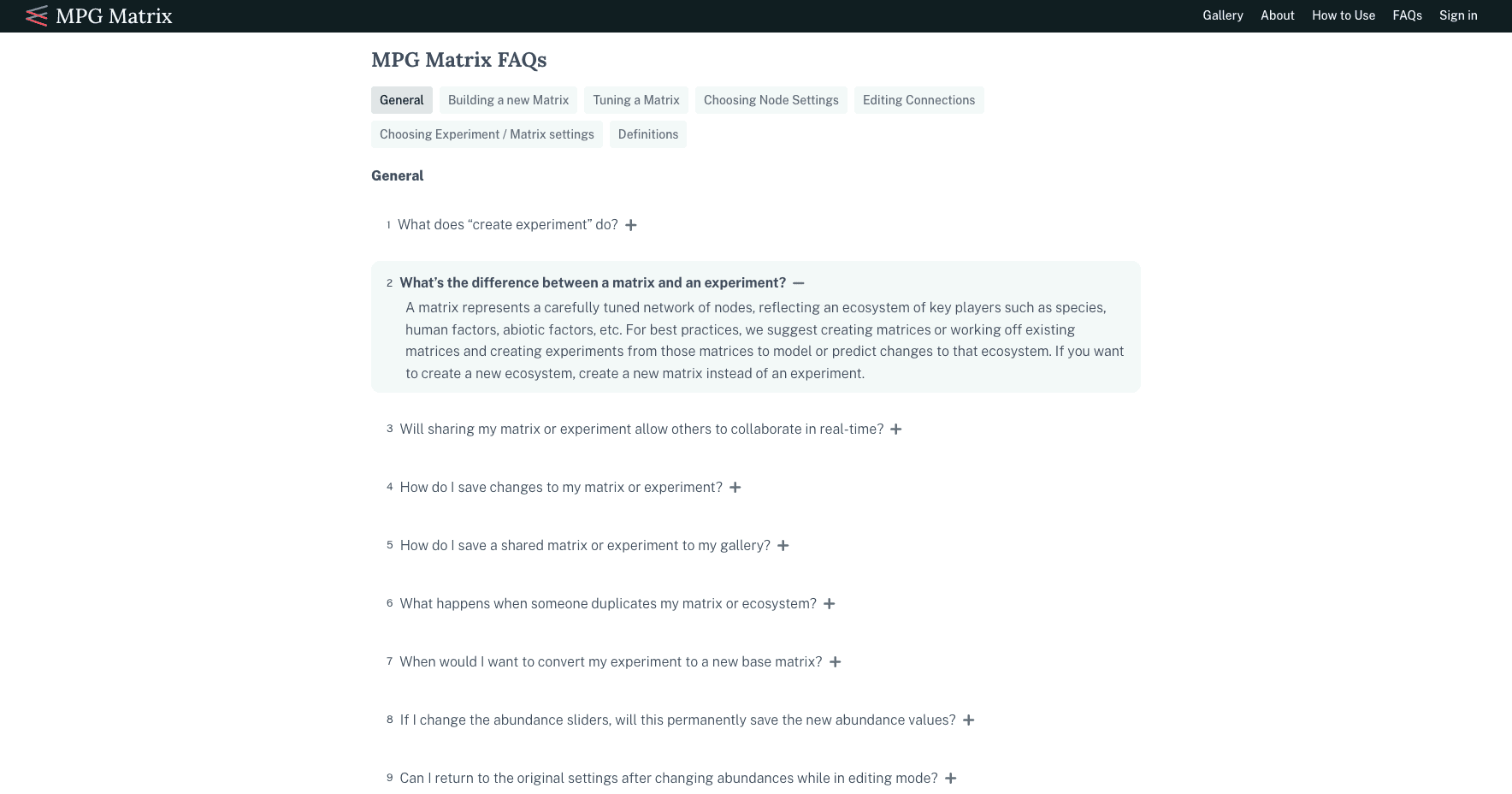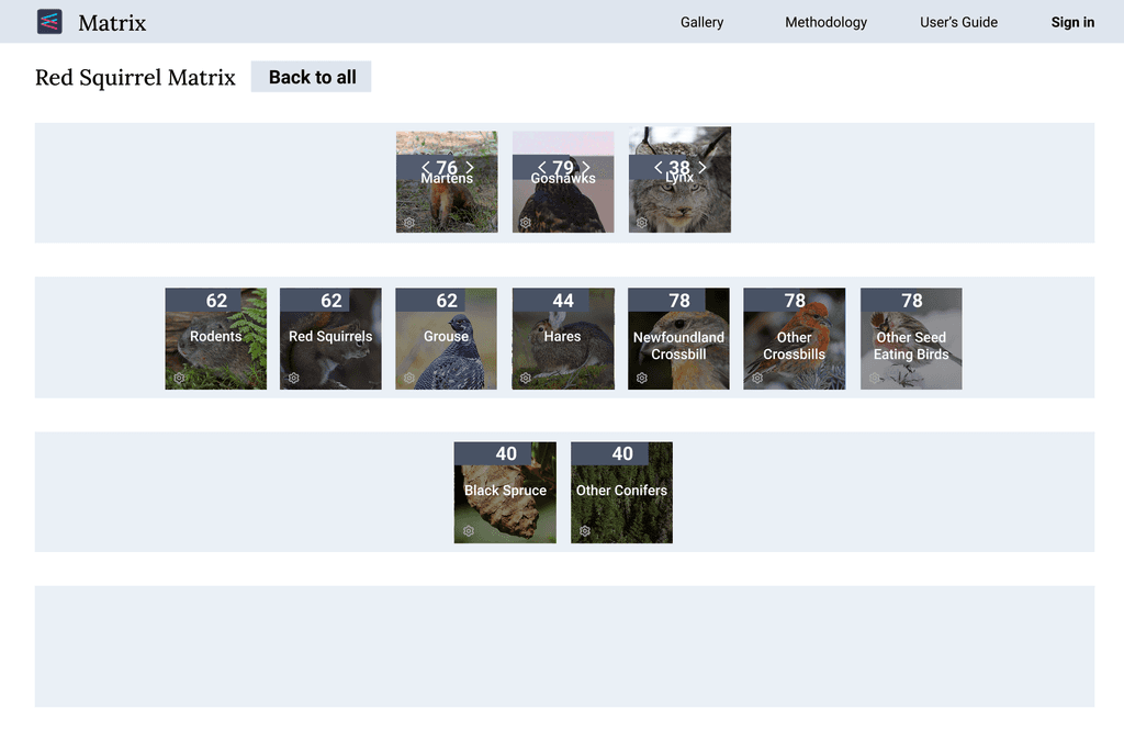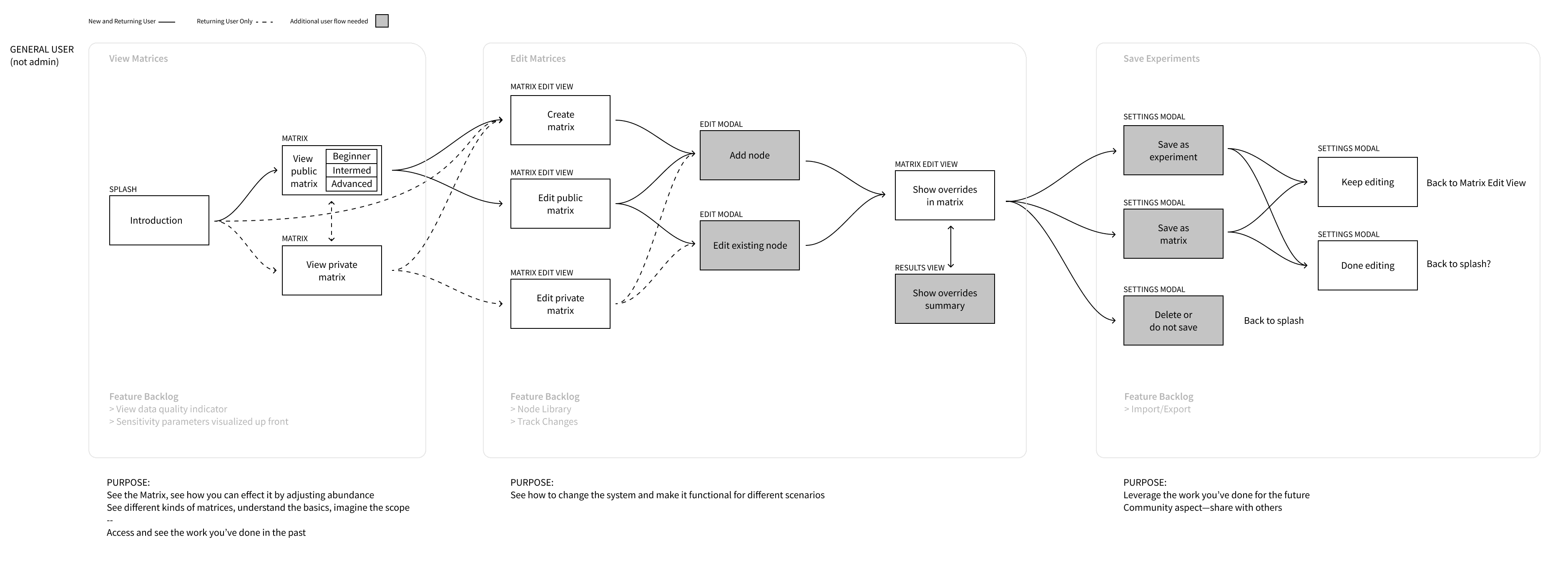 MPG Ranch referred to an ecosystem in their model as a matrix. While a matrix involves many complexities, it can be understood simply as a network of nodes representing key ecosystem players, such as plants, animals, and abiotic factors. Changes to a node or its relationships with other nodes alter the overall ecosystem. Since most user interaction in the application revolved around viewing and manipulating matrices, we outlined how users would engage with them before, during, and after use.
